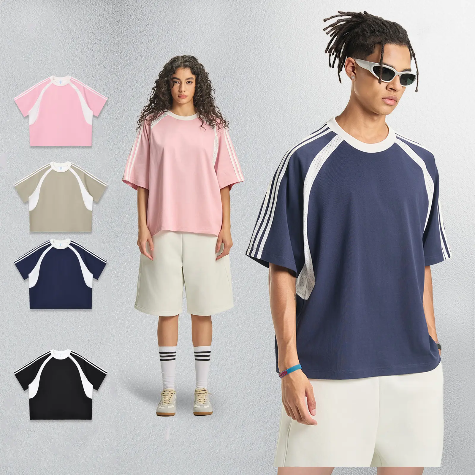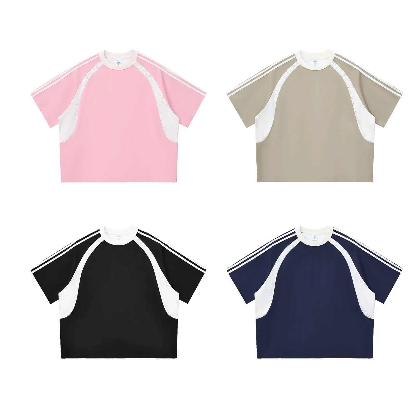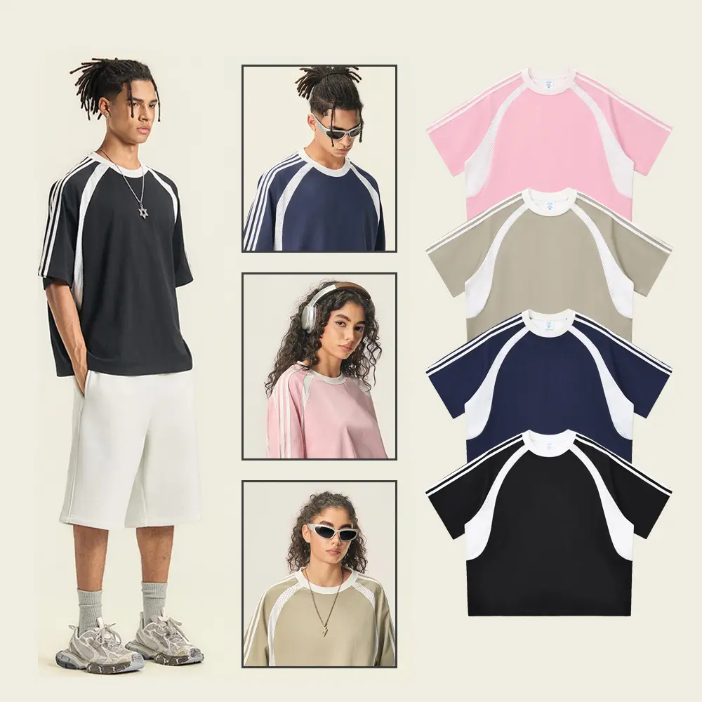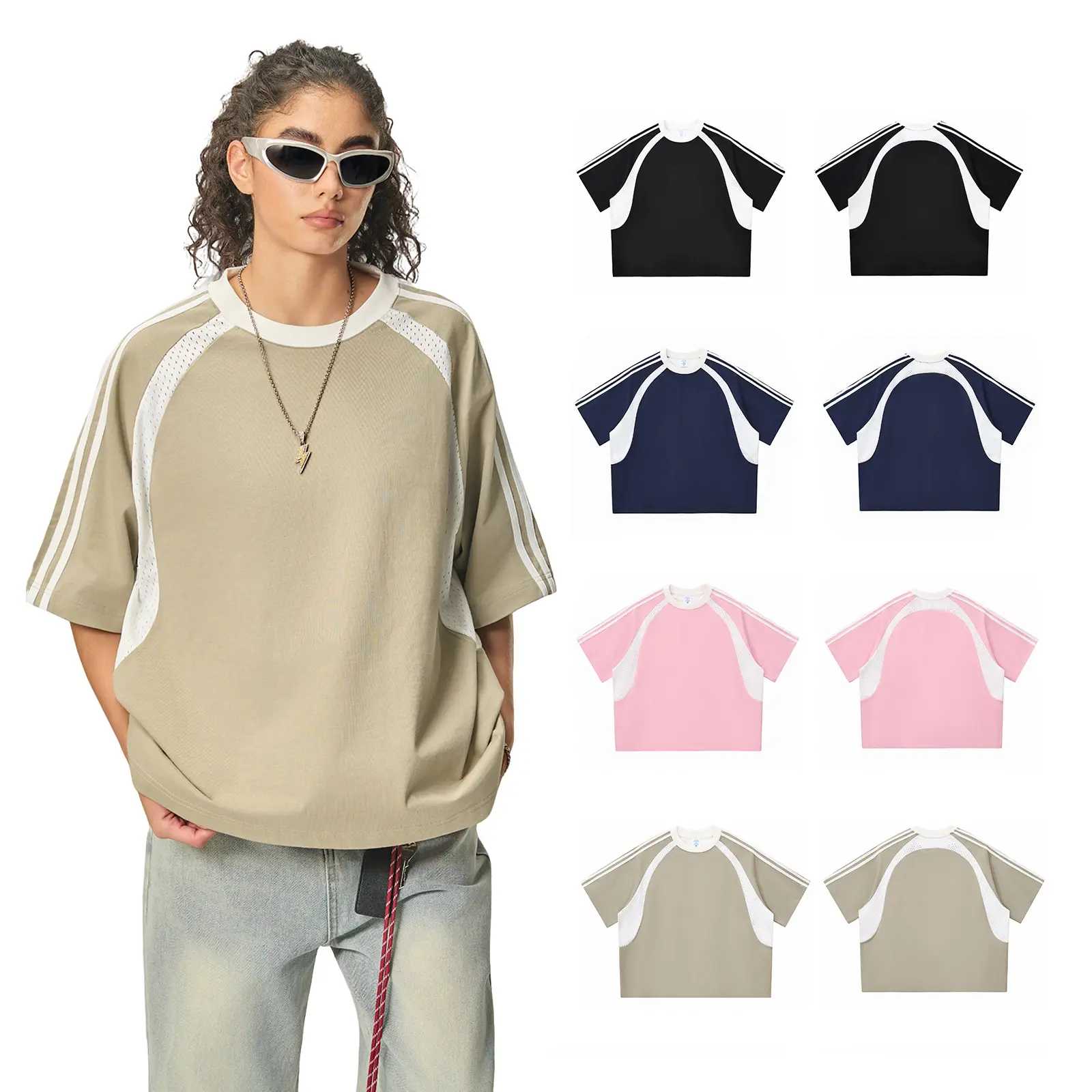 260GSM 100%Cotton Men's Retro Mesh Patchwork Streetwear Oversized Loose Reglan Short Sleeve T-Shirt