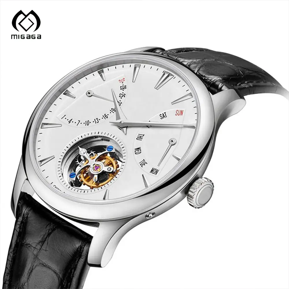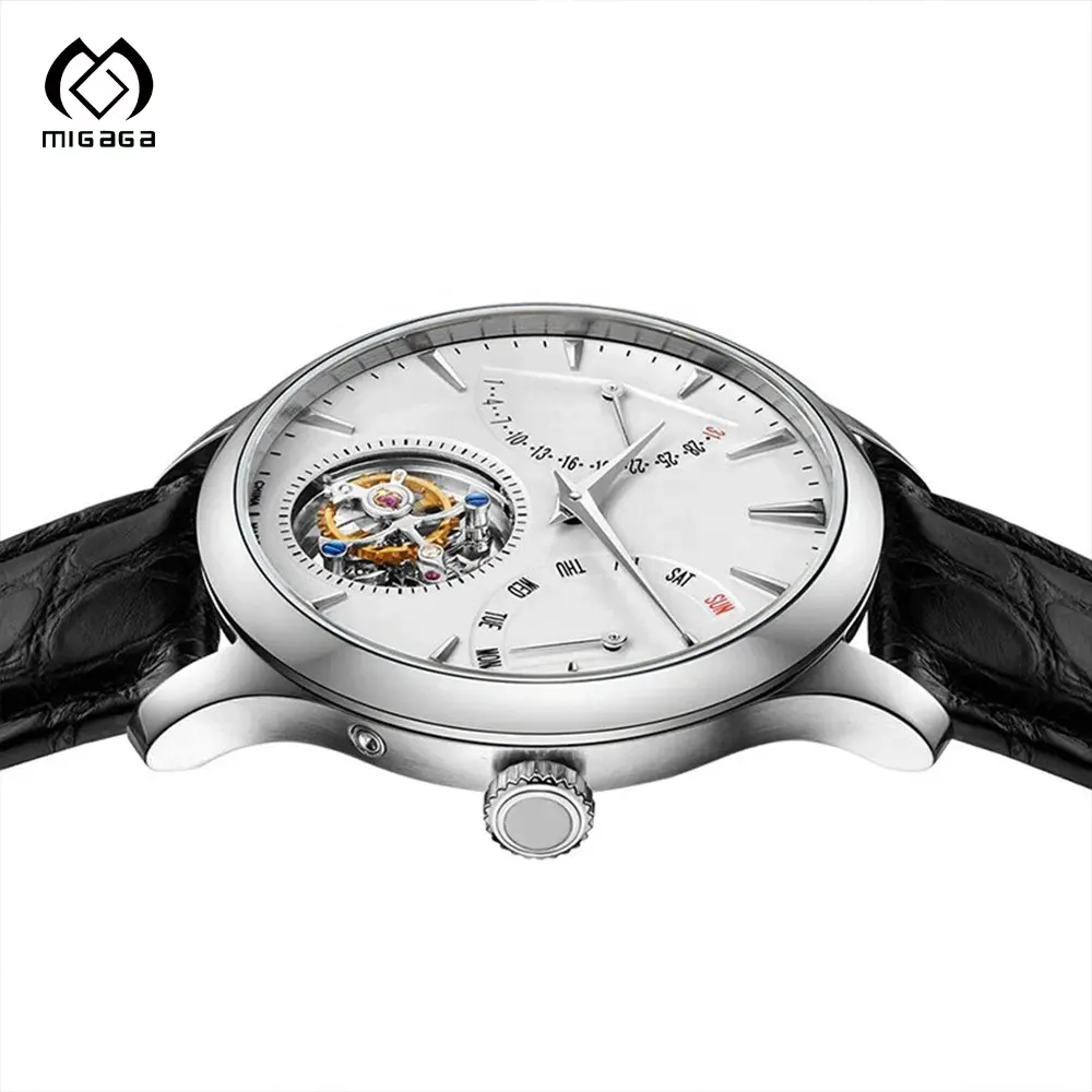 Cusrom Black Leather Band Water Resistant 35mm Dial Mechanical Movement Tourbillon Watch for Men