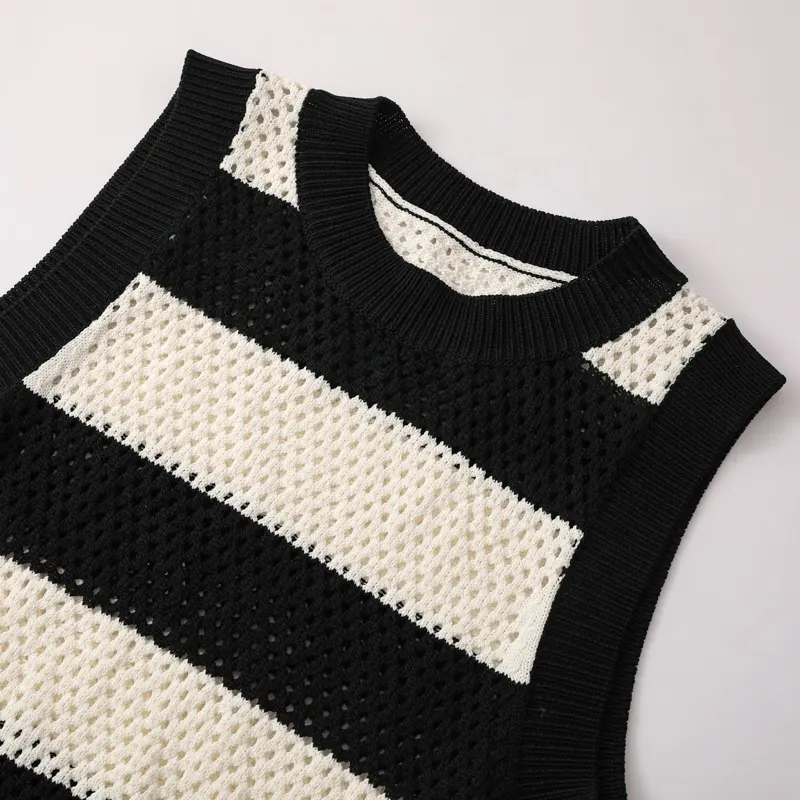 Custom Summer Women Knit Vest Dress Crew Neck Sleeveless Striped Women Dress Hollow Out Slit Long Knit Dress for Women