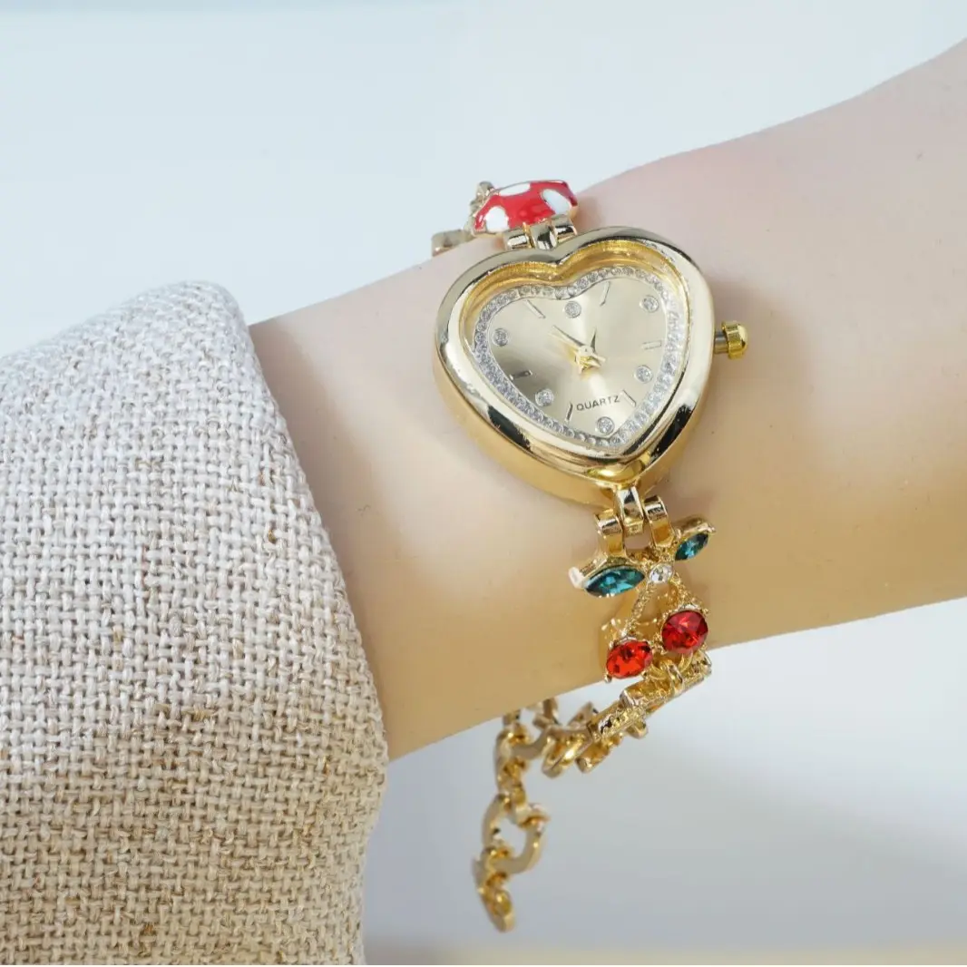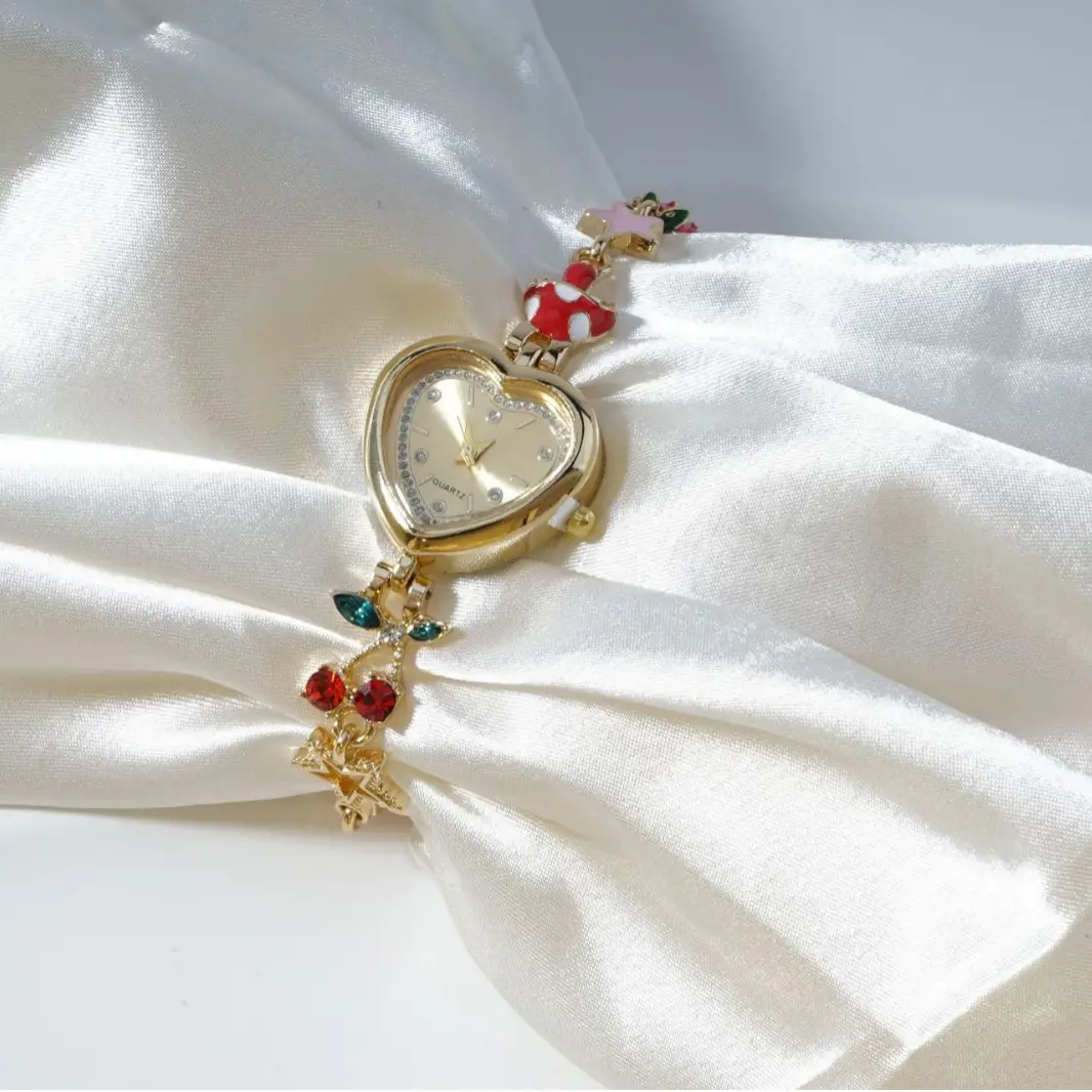 Gold Quartz Watch Heart-shaped Dial 30mm Pointer Vintage Forest Floral Cherry Fruit Decorative Bracelet Women's Cute Watch
