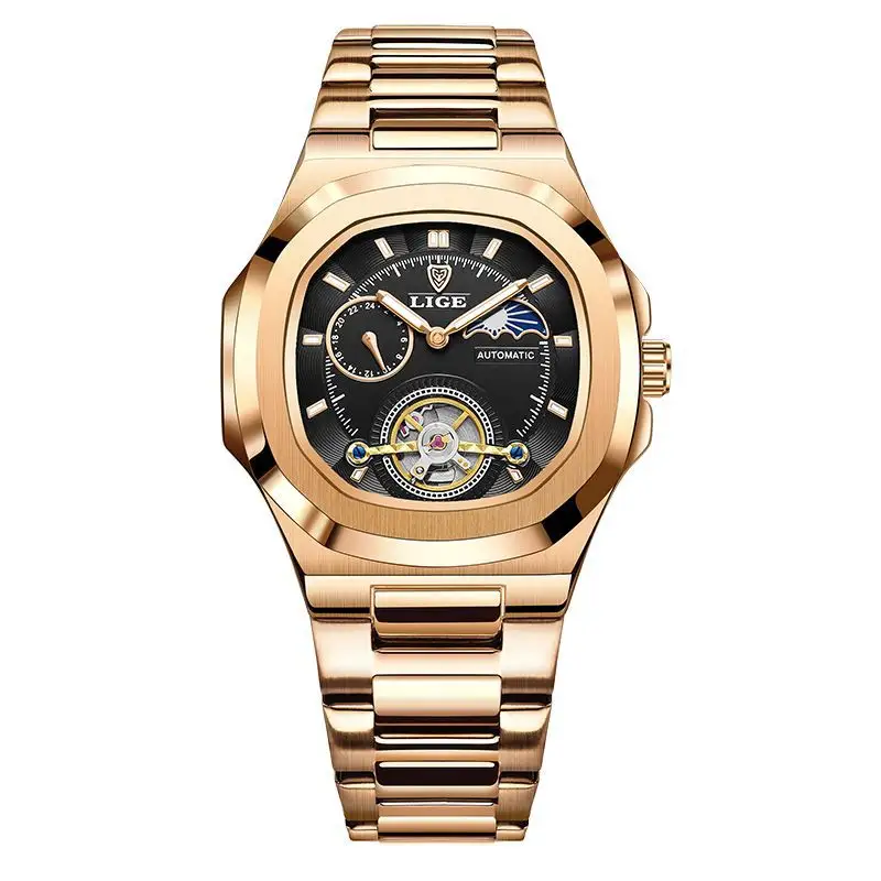 Luxury Business Mechanical Watch Single Tourbillon Men Square Stainless Steel Glass Charm Moon Phase Water Resistant