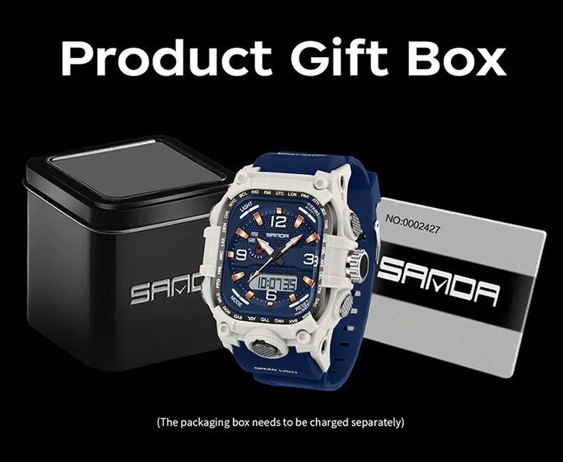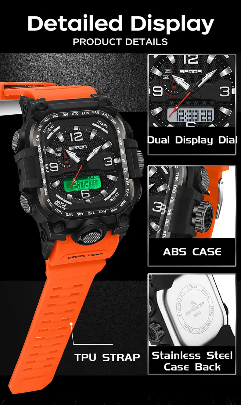 Multi-Functional Analog-Digital Sports Watch for Men Multi-Time Zone 50M Waterproof Square Acrylic Dial Wristwatch
