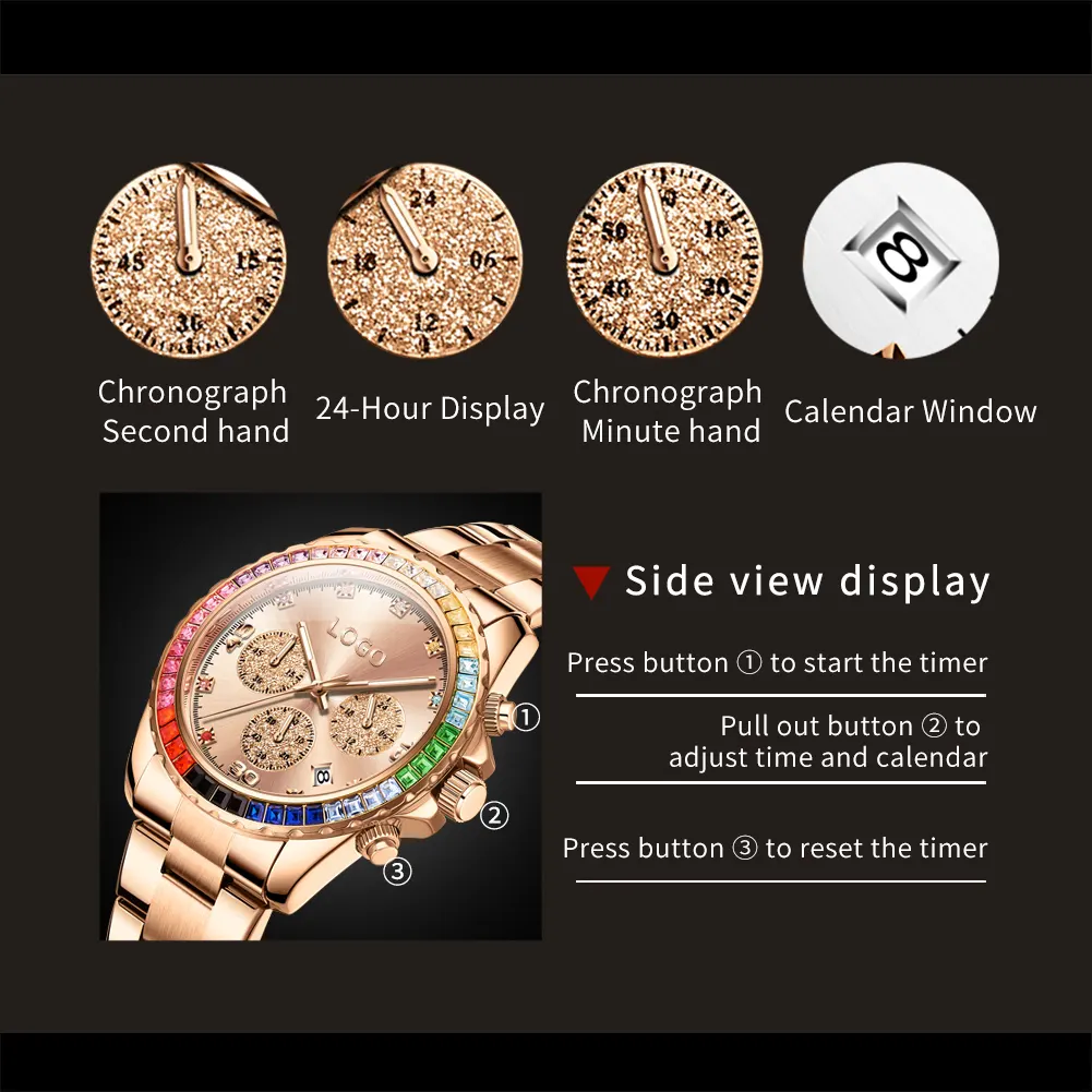 OEM 2939 Custom logo Stainless Steel Multifunctional Fashion Sports Watch Diamond Waterproof Quartz Watch for Man