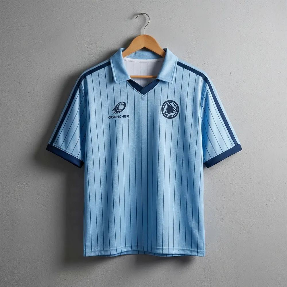 OEM ODM Custom Blokecore Retro V Neck Soccer Jersey Light Blue Navy Stripe Full Sublimation Football Jersey for Team