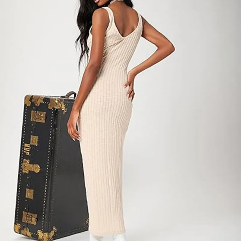Women's Pure Cotton Slim Fit Summer Tank Dress Sexy Ribbed Knit V Neck Midi Bodycon Casual Club Party Sleeveless Dress